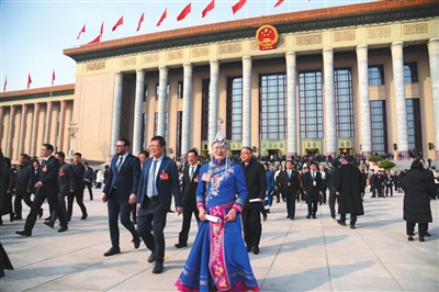全国政协十四届二次会议闭幕会后,住浙全国政协委员雷群芳着畲族服装信心满满走出人民大会堂。