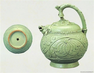 | 五代青釉剔刻花狮提梁倒流壶 |