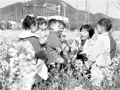 日前,湖州吴兴道场乡政协工作联络组在施家桥村开展“走进春天里”活动,培养孩子们爱家乡、爱自然的美好情感。图为区政协委员冯艳文带领孩子们走进油菜花田,感受人与自然的和谐关系。