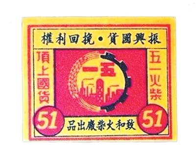 1920年5月1日,为庆祝我国历史上的第一个“五一”劳动节,广州致和火柴厂出品的火柴,其火花主图是由代表工农阶级的齿轮和麦穗所组成的圆形图案,中心还有“五一”字样与工厂图。在图案的上方,有反映特定历史时期的“振兴国货,挽回利权”字样。这枚火花表达了对广大劳动者的尊重和对“劳动创造世界”观点的支持。