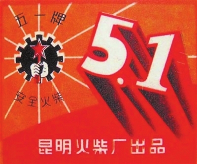 1950年,为纪念中华人民共和国第一个“五一”国际劳动节,昆明永明火柴厂特意设计出品了“五一”牌火花。其主色调为红色,左上角印有商标图案,由齿轮与一只举起红星的手组成,右侧是硕大醒目的“5.1”字样,表现了工人阶级与劳动节的紧密联系。