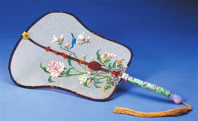 牡丹纨扇(图1)。这是一件清中期的象牙丝编织牡丹花鸟纨扇。扇面为腰圆芭蕉形,上部微卷。扇边包镶玳瑁框,淡绿色彩绘花蝶纹画珐琅柄,嵌骨珠,并系有明黄色丝穗。扇面中心嵌棕竹梁,镶有铜镀金点翠錾蝙蝠纹护顶,梁的上、中、下部各嵌有浮雕盘夔和宝相花纹的橙、紫、黄、红四色蜜蜡护托。细润洁白的扇面是用薄如细篦的牙丝编织而成,牙丝宽不足0.1厘米。扇面自柄托向上嵌有染牙浅浮雕牡丹、玉兰等花卉及蓝甸鸟。扇面纹饰精致细密,孔缝均匀,经纬片的拼合天衣无缝,色彩绚丽,雍容华贵。