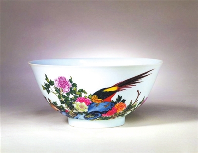 牡丹瓷碗(图2)。这是一只清雍正时期的珐琅彩雉鸡牡丹纹碗。碗敞口,弧壁,圈足,外壁以珐琅彩装饰。一侧绘雉鸡牡丹图,画面中心一只体格健壮的雉鸡,在山石牡丹丛中寻食。牡丹花饱满圆润,使“国色天香”在瓷器上的表现达到了顶峰。周围的山石花草以粉红、藕荷、杏黄、淡黄、水绿等娇嫩颜色相衬托。此碗胎体极薄,属于半脱胎,内外底釉洁白如雪,莹润如玉。画面集诗、书、画于一体,纹饰色彩鲜艳,工笔细腻,为雍正朝珐琅彩代表作品之一。