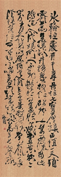 该诗书作为徐渭较有代表性的草书作品,收藏于山西省博物院。从其只钤“青藤道士”印而未见干支纪年的署款方式来看,大致可推测此卷是隆庆元年(1567)后某年中秋在狱中所作。彼时,可能在解除枷栲的49岁(隆庆三年)至52岁(隆庆六年)出狱前之间。从笔法看,此卷运笔颇近米芾书风的吞吐腾挪、骤雨旋风之势,满纸云烟,奔放狂纵;似奔蛇走虺、戈戟森然。那种“狂来轻世界,醉里得真如”的滋味,摄人心魄。从结体看,此卷点画连绵,流畅劲健,跌宕多姿,接近徐渭中年临摹祝允明的风格,足以领略到他“八法之散圣,字林之侠客”的韵味。从墨法看,此卷徐渭以焦墨入书,突破了苏东坡倡导的“小儿目睛”古典墨法,开启了书法用墨新时尚,后半幅“离,雨,顺”“阳,变,理”“山,河,大,地”等,用焦墨写出的飞白书,真有云龙雾豹、天泉飞花的境界。细酌慢品,有“时而秋风撕裂、时而山谷盘旋、时而平野回荡”的音响效果,变幻莫测,气象万千。