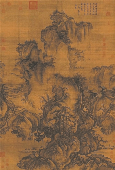 郭熙在《早春图》中精妙地运用了“高远、平远、深远”的构图技法。画面主体聚焦于中轴线,通过近、中、远景的巧妙交织,营造出和谐且层次分明的视觉效果。这样的布局既展现了高山的雄伟,又赋予画面深远的空间感和平远的开阔视野。他运用粗犷扭曲的线条勾勒山石轮廓,再以干湿浓淡各异的墨色层层皴擦,创造出独特的“卷云皴”技法。树木枝干以“蟹爪枝”形态呈现,用笔瘦硬,凸显冬季的萧瑟;而新叶则以粗笔点缀,水纹则以细笔勾勒,笔法墨趣虽异,却皆生动传神。