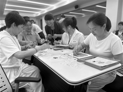 为传承优秀传统文化,日前,青田县政协文化文史和学习委联合鹤城街道新建社区等开展“非遗文化进社区”活动,图为居民兴致勃勃体验非遗宋锦珍画。