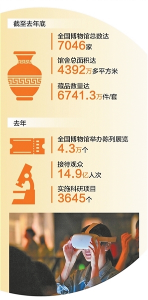 国家文物局最新数据显示:近10年来,我国年均新增200多家博物馆;截至去年底,全国博物馆总数达7046家,博物馆免费开放率达91.46%;去年,全国博物馆举办陈列展览4.3万个,接待观众14.9亿人次。规模增量、内容提质、科技赋能、服务升级,博物馆事业正枝繁叶茂、蓬勃发展。