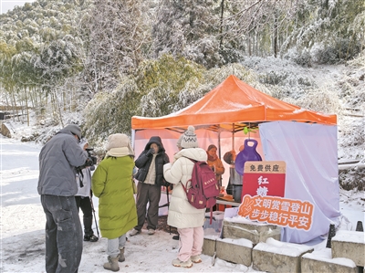 寒冬时节,安吉政协报福镇委员履职小组在深溪坞村游客上山必经之路搭起公益补给摊,为游客提供热水、驱寒姜茶与暖心鸡汤,让游客暖胃更暖心。通讯员 袁媛
